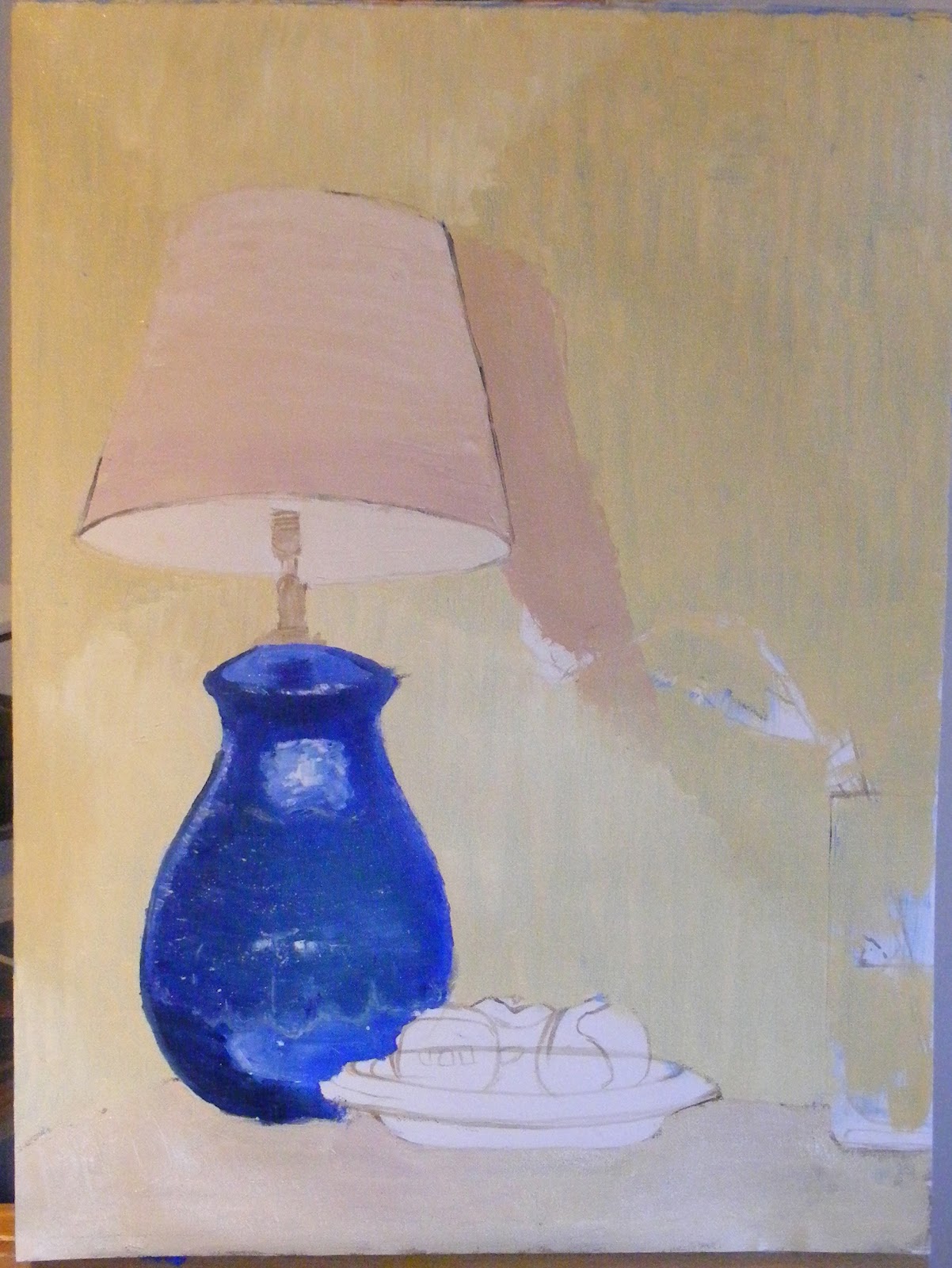 The next stage was a loose underpainting in acrylic (mainly for speed) in ultramarine and white for the background and lamp and raw umber for the table. As I said previously, I felt the blue over the creamy yellow walls was too strong, so I decided to underpaint the blue this time, to allow me to vary the thickness of the paint going over the blue.